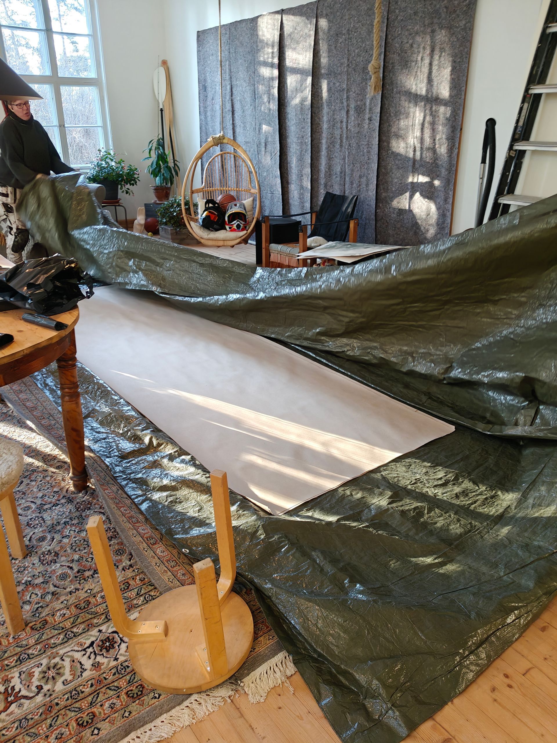 Maalaus Pitkäsen työmailla käytämme Paavo-pinkopahvia. Tässä kohteessa opiskelijat käyttivät niin sanottua apteekkipahvia. Tämä pahvi on kapeampaa ja ohuempaa, ja sen väri on ruskea molemmin puolin.